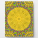 This artwork features a central, circular design that resembles a stylized sun or flower. The central motif is highly symmetrical and detailed, creating a striking focal point. Surrounding it is a background filled with a repeating pattern of smaller circular shapes, enhancing the overall composition's balance and visual density.