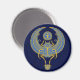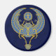This ancient Egyptian scarab beetle has large wings outstretched upwards on both sides. The intricate lines of the beetle are painted a bright yellow while the interior is a vibrant blue. The scarab’s front two legs are reaching upwards, holding a sphere with a simple Ankh design in the center. The beetle’s four other legs are hanging down with another circle at the bottom. This Egyptian pattern sits on a deep blue background creating a stylish magnet.