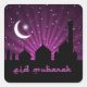Eid Greeting illustration with silhouettes of the moon, stars and a mosque on a purple night sky.