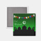 Eid Mubarak greeting illustration with a festive and colourful garland in a magic night scene with a mosque silhouette and the moon and stars on a green night sky.