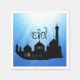 Black silhouette of a mosque on a blue sky with sun and sunrays, greetings and wishes for Eid.
