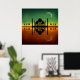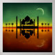 Eid Mubarak greeting illustration: a mosque and palms silhouette on a night sky background with the moon and stars reflecting on water.