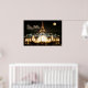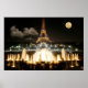The Eiffel Tower bathed in yellow illuminations and framed by a massive moon and spectacular fountains.