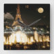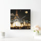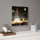 The tower stands behind illuminated fountains whilst a massive moon looks down.