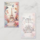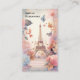Business card with a stylized Eiffel tower image surrounded by pretty butterflies and delicate garden flowers.