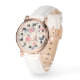 A watch with an elegant pattern. Pink roses, blue-grey butterflies and an Eiffel tower. A French themed pattern.