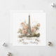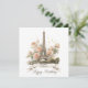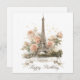 An elegant and romantic greeting card design featuring a beautiful watercolor-style illustration of the Eiffel Tower. The iconic Parisian landmark is surrounded by soft, pastel pink and cream roses and accented with delicate golden speckles. Customize with your own text the ribbon banner at the bottom display.