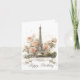 An elegant and romantic greeting card design featuring a beautiful watercolor-style illustration of the Eiffel Tower. The iconic Parisian landmark is surrounded by soft, pastel pink and cream roses and accented with delicate golden speckles. Customize with your own text the ribbon banner at the bottom display.
