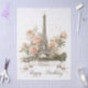 An elegant and romantic greeting card design featuring a beautiful watercolor-style illustration of the Eiffel Tower. The iconic Parisian landmark is surrounded by soft, pastel pink and cream roses and accented with delicate golden speckles. Customize with your own text the ribbon banner at the bottom display.