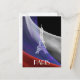 An icon of the Eiffel Tower in Paris, France under waves of sheer/transparent fabric in the colours of the french flag, blue, white and red. White letters and the text: Paris