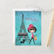 Eiffel Tower Paris Girl and Cat Blue Damask Postcard