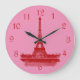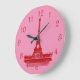 This clock is printed with an image of the Eiffel tower in a pink and red colour scheme.
