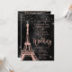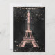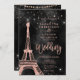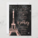 A modern, chic and glamourous wedding invitation with a hand drawn rose gold glitter french Paris theme Eiffel Tower with rose gold glitter diamond sparkles on a black watercolor background.