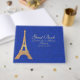 Paris themed Sweet 16 party guest book done in a royal blue on blue pattern, with graphics of a gold glitter looking Eiffel tower. Personalize the text fields for your special day.
