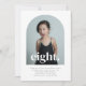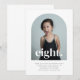 A simple 8th Birthday invitation featuring your own photo in an arch shape and the words 'eight.' over the top.