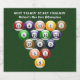 A set of billiard balls in shiny hues of yellow, blue, red, purple, orange, green, tan and black, with green background to resemble a real pool table. The balls are arranged in one of the proper racks in standardized eight-ball: two rear corner balls in different suits, 8 ball in the centre and apex ball on the foot spot. A fun and colourful recreational illustration for the cueist, pool player, billiard player, snooker player or cue sportsman in your life. Also makes wonderful decor for a man cave, game room, billiards parlour, pool hall, bars, tavern, pub or bachelor’s party. Customize with your names, favourite quote or other text.
