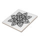 Ceramic tile in an abstract, black and white flower and leaf mandala in an eight point star pattern