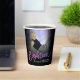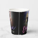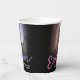 Eighteen purple to pink coloured style effect script text on black paper cups. Personalize these cups with two photos of your birthday girl turning 18, one on each side (for past and present plus add your own name or message. Ideal for a 18th birthday party or surprise girls eighteen years event. Other years and matching items are available. © Original design by Sarah Trett for www.mylittleeden.com on Zazzle.