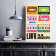 Eighties Mix Tape Cassette Poster - Make no mistake there is definitely an art to making an awesome mix tape. A lot like the art to having a happy fulfilling life. Whether you were trying to win somebody's heart or just turn on your friends to some excellent tunes, the mix tape was a serious business back in the day. Brighten up your office or home entertaining area with this fun multi colored K7 music tapes poster in a vintage style. This would also make the ideal gift for that friend, family member or work colleague who loves all things retro. This inspiring poster talks about Life - after all, life is a mix tape.