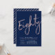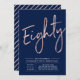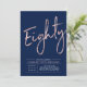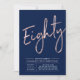 Celebrate your special day with this simple stylish 80th birthday party invitation. This design features a rose gold brush script "Eighty" with a clean layout on a navy blue background. You can customize the text and background colour. More designs and party supplies are available at my shop BaraBomDesign.