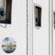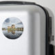 Round photo magnet with historic Eilean Donan Castle on a quiet morning with reflection in the still water at the western coast of Scotland, near Isle of Skye.