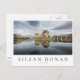Photo postcard of historic Eilean Donan Castle on a quiet morning with reflection in the still water at the western coast of Scotland, near Isle of Skye with a white edge and the text 'Eilean Donan, Scotland'.