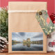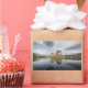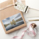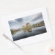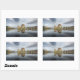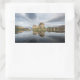 Rectangular photo sticker with historic Eilean Donan Castle on a quiet morning with reflection in the still water at the western coast of Scotland, near Isle of Skye.