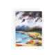 A seascape with a beach area in the foreground, calm turquoise water, and a range of mountains in the background. The sky is dynamic, with dark, heavy clouds contrasting with bright white and yellow accents, adding a sense of movement and drama to the serene landscape below.