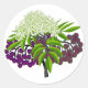 A branch of elderberry with the delicate white blooms, green leaves and dark blue-purple berries. Digital drawing