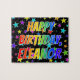 This vibrant and lively birthday-themed jigsaw puzzle design has the message "HAPPY BIRTHDAY, ELEANOR" with the characters having a colourful rainbow spectrum inspired gradient pattern, along with a fun field of stars background pattern. A vibrant puzzle like this might be used to send a birthday greeting message to somebody named Eleanor. [~Z0000468]