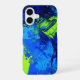 A vibrant and abstract painting featuring thick, expressive brushstrokes of paint in a dynamic mix of electric blue, deep navy, and vivid lime green. The texture is palpable, with layers of paint built up to create a sense of movement and energy. The composition is chaotic and energetic, with the contrasting colours clashing and blending in a powerful, non-representational way.