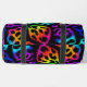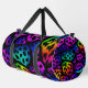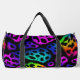 This image features a duffel bag adorned with a striking and stylized leopard print pattern. The spots are filled with a vibrant, gradient-like texture that mimics the appearance of colourful fur or threads, transitioning through shades of pink, purple, blue, green, and yellow/orange. These vivid colours stand out dramatically against a solid black background. Black carrying straps are prominent across the top. The design gives the bag a dynamic, modern, and artistic feel, making it a bold accessory for travel or everyday use.