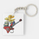 An electric guitar in red with a drum set behind it. This design looks really effective on these Keychain