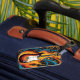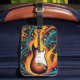 A striking electric guitar stands amidst swirling flames and colourful patterns, embodying the spirit of rock music in a dynamic, artistic display.