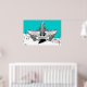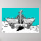 Black white electric guitar with wings poster print, featuring an electric guitar, wings, flames and swirls on music pentagram, notes and treble clef on turquoise blue background. A great gift for a musician, guitar player or lover.