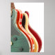 Poster with a closeup vertical picture of four colourful electric guitars.