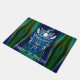 Futuristic looking door mat, with graphic artwork of A metallic pink and red robot head with electrical currents going up and down from it. Custom text, on the bottom, is ready to personalize to read what you want.