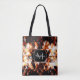 Personalize with your initial and name. All over print tote bag with Electrifying orange sparkly triangle fire flames. Orange, black and white triangle geometric mesh with abstract smoke and sparkles print.