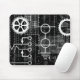 This cyberpunk-inspired design features binary, math, gears, and electronic symbols in white on a black background.