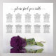 This beautiful wedding seating chart has table assignments for 100 guests at 10 tables (10 people per table.) The design is stylish, classy, romantic and chic, featuring a single plum purple or eggplant coloured rose reflecting in water with waves and ripples. There is a lacy script calligraphy title reading "please find your table" as well as space for the names of the couple and the wedding date. Great way to make your reception beautiful while helping your guests find the right seat.