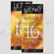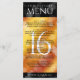 Add sophistication to 16th golden topaz wedding anniversary celebrations with this dinner menu, which features elegant lettering and hexagonal confetti on deep red-yellow-orange moire and black backgrounds. Customize with couple's names, dates of marriage, venue details, menu items, and congratulatory messages.