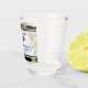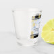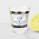 Celebrate the 18th wedding anniversary with this commemorative shot glass. Elegant black serif and script lettering with gold-dusted hexagonal confetti on a white and porcelain blue marbled background edged by black bars add a memorable touch for this special occasion and milestone. Customize with the happy couple's names, an initial for their surname, years of marriage, and personalized congratulatory messages for their porcelain anniversary.