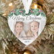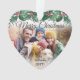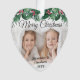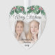 Celebrate the simple joys of the holidays with a custom Merry Christmas two photo heart-shaped acrylic ornament. The pictures and all wording on this template are easy to personalize and can be different or the same on front and back. The script can be changed to First Christmas, Seasons Greetings, a name, or other text of your choice. The modern red, green and white oval design features botanical holly leaves and berries, elegant classic script typography, and 2 favorite photos. This unique holiday keepsake adds a stylish touch to Xmas home decorations. Merry Christmas!