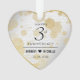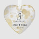 Célébrez le 3e anniversaire du mariage en cuir avec cet ornement commémoratif! Un élégant lettrage noir avec des confettis hexagonaux dorés sur un luxueux arrière - plan en cuir blanc bordé d'un contour stylisé d'un coeur en feuille d'or feuilleté apporte une touche mémorable à cette occasion spéciale et à cette étape. Customisez avec les noms du couple et la date du mariage. Reverse affiche un design identique. Design © W.H. Sim. Voir plus sur zazzle.com/expressionsoccasions