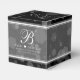 Celebrate the 4th wedding anniversary in style with this commemorative favor box! Elegant black script and serif lettering with hexagonal confetti on a gray linen background edged with black bars add a memorable touch for this special occasion and milestone. Customize with the happy couple's names, add an initial or monogram for their surname, and add dates for their linen anniversary. Personalized messages can be added to the top and side panels.