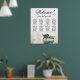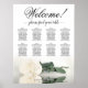 This stunning wedding seating chart includes 8 tables and showcases a modern and romantic floral design. A long-stemmed ivory, white, or cream-coloured rose is displayed on its side, reflecting in a pool of water, adding to the elegance of the chart. The title, "Welcome! please find your table," is written in elegant script calligraphy, while the names of the couple and the date of the wedding are located at the bottom. With seating arrangements for 80 people and 10 seats per table, this seating chart is a fantastic way to greet guests and help them locate their seats at the reception.