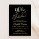 Elegant black 90th birthday party invitation featuring "90 & Fabulous" and her name in stylish calligraphy scripts and the event details in simple modern lettering, all rendered in your choice of genuine gold, silver or rose gold foil.