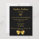 Elegant, classic, glamourous and feminine style party invitation. A gold coloured ribbon and bow with golden glitter and sparkle, a bit of bling and luxury for a birthday. Black background. With the text: 90th Birthday! on front. Template for your photo.