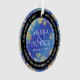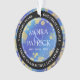 Célébrez le 9ème anniversaire du mariage lapis lazuli avec cet ornement élégant! Un élégant lettrage blanc avec des confettis hexagonaux patinés en pyrite sur un arrière - plan bleu azur et moucheté ajoute une touche mémorable pour cette occasion spéciale et cette étape importante. Personnalisez avec les noms du couple, les dates du mariage, et les messages de félicitations sur les jantes. Reverse affiche un design identique. Cette conception est optimisée pour la forme circulaire. Design © W.H. Sim. Voir plus sur zazzle.com/expressionsoccasions