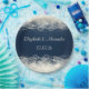 A fancy elegant abstract design with cream coloured lace and pearls made with circles and bubbles. The background is dark blue with faded squares off to the side. Pretty and delicate design. Congratulations written in a fancy script font. Customize / personalize with the bride and grooms name and their wedding date.